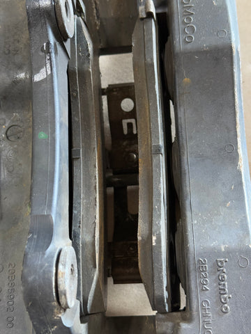 Passenger side caliper has heavy rashing on it as shown. One of the bleeders is bent as well as a broken off mounting bolt. Bolt and bleeder screw will need removed and replaced. Missing the rubber brake line as well. Caliper will need refinished. LH caliper is in great shape. Normal wear from everyday use. Brembo lettering looks good. Some rock chips/scratches from everyday driving. Pads still have some life left. Everything was working when pulled from the vehicle.