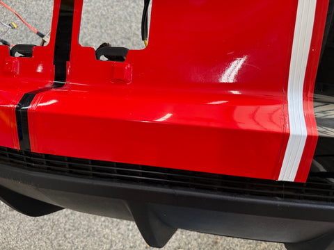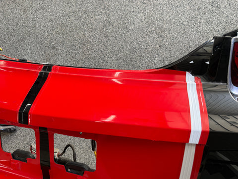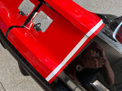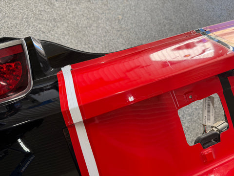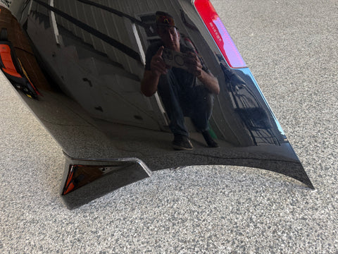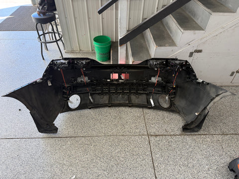 Complete take off. Bumper has light scratches and small imperfections all over as shown. Bumper will need some work and painted to be perfect and match. Lots of stuff was stuck or glued onto the bumper. The tail light trim was duck taped over with the chrome kind. The stripes you see are cheap vinyl. Mud flap things on the sides are glued on. Bumper will need stripped and repainted after some work. Regardless bumper will need repaint. It does have some aftermarket tail light bulbs and diodes/resistors installed as well. Lower valence looks pretty good with light scratches. NO broken tabs.