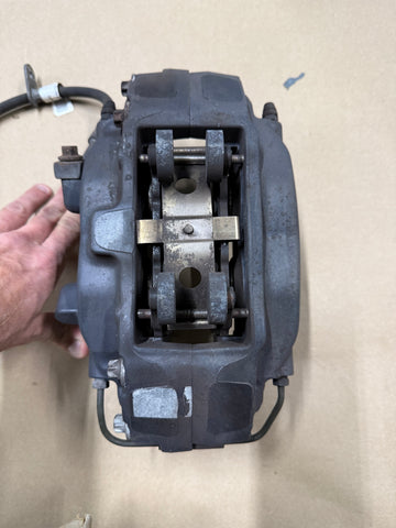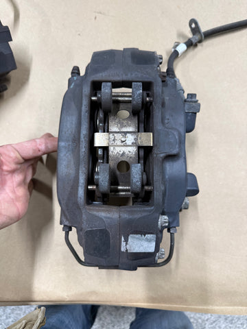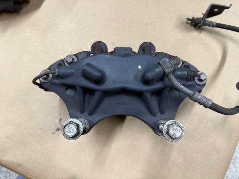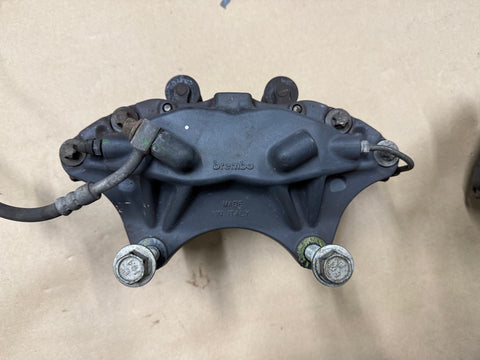 Front Brembo calipers. Everything is in good condition. Finish is faded but not the worst we've seen. Lettering still looks good. Normal wear and tear as well. Pads have some life left on them. Everything in perfect working condition. Calipers did NOT leak. Will need refinished to be perfect.