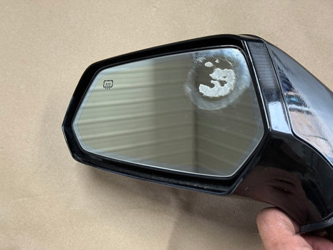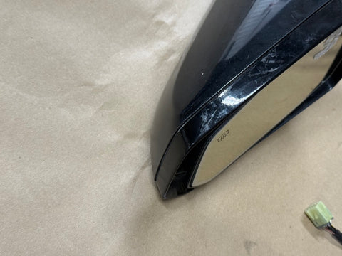 LH/driver side mirror. Black in color. Electric Mirror. The glass is in okay shape with scratches and adhesive residue. They had a bubble mirror stuck on the glass. There are some rock chips from everyday driving on the housing. Mirror will need repainted. Pictures of exact condition.