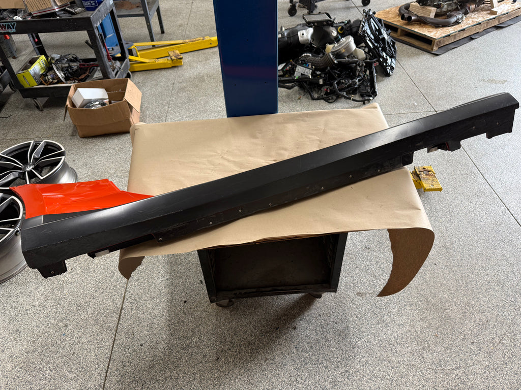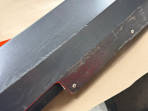 RH/passenger side skirt molding. Good condition. Paint is in okay used condition. There are some rock chips and scratches from everyday driving. Missing some paint on the rear upper corner. Something got into the skirt a little as well. Will need fixed and repainted before install. Scratches and scuffs on the black skirt extension as shown. Small tear on the bottom of extension towards the front side. Extension is riveted on. There are some broken white clips and missing clips, almost impossible to get off without breaking them. If you want perfect you will need to repaint it.