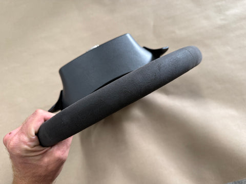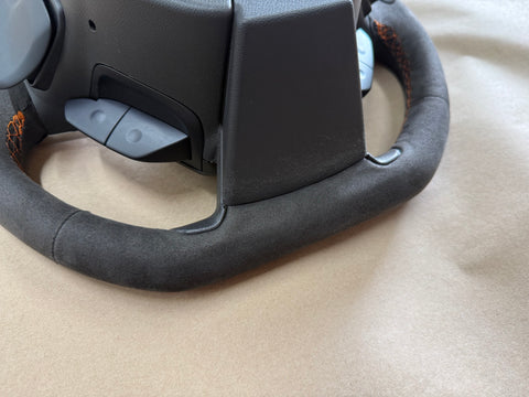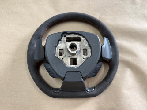 Black suede with orange stitching. Suede is in good shape. Could use a better cleaning before install. There is some light wear on the top of the wheel. Buttons are in good shape. No damage to steering wheel. Overall a pretty nice steering wheel.