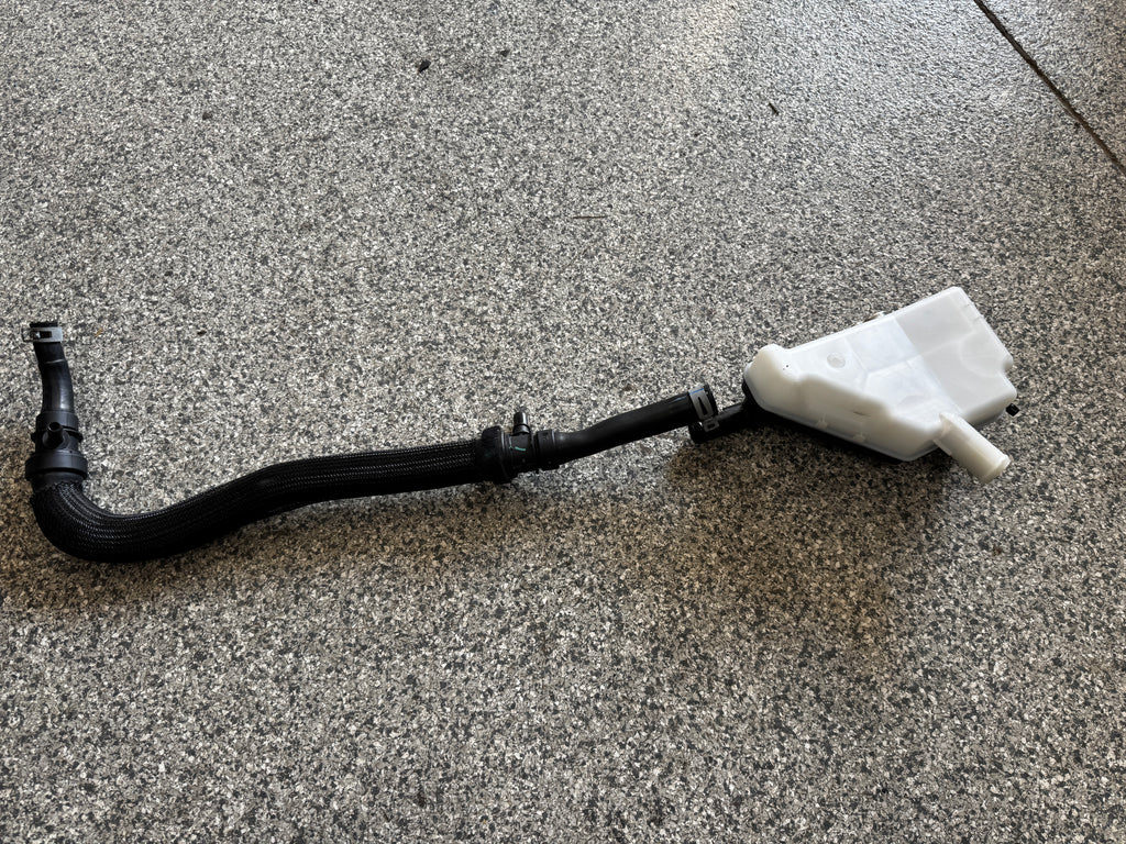 OEM radiator overflow coolant tank with rubber hose. Take off is in pretty nice shape. No damage to tank or hose.
