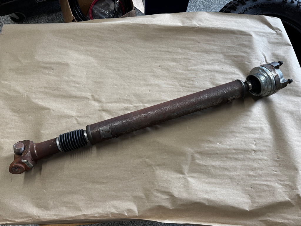 This is the front transfer case driveshaft. Take out is in great shape. No damage to the piece. Part number is pictured.