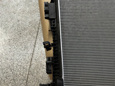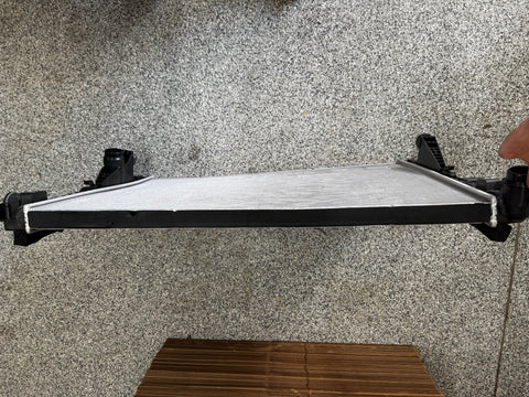 OEM primary radiator cooler. Low mileage take out. Good shape. Slightly tweaked but easy to form. There are some marks on the phins from being used. There is one broke tab/clip. I think one of the coolers may slid into it. Not a 100% positive. Did not appear to leak. Please cross reference the part number and vin if needed. This information is for you to do your own research.
