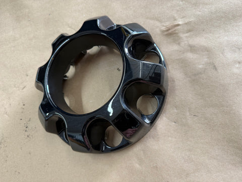 OEM Ford. Front center cap. Gloss black finish. There are some scratches and a couple of rock chips or nicks that are pictured. No damage.