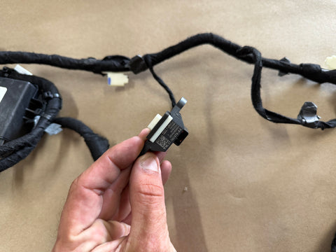 This harness connects the door controls to the main body harness. Part numbers are pictured. No damage to wiring harness or ends. Take off is in great shape. Like new.