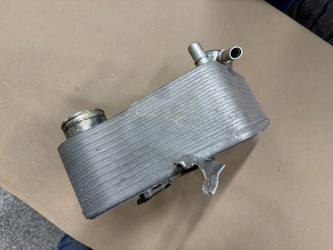 OEM Ford intercooler. Take off is in good shape. One of the hose ports is slightly bent as shown. Not that bad, should be easy to straighten out. Part number is pictured.