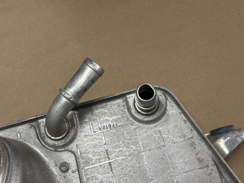 OEM Ford intercooler. Take off is in good shape. Both of the hose ports are slightly bent as shown. Not that bad, should be easy to straighten out. Part number is pictured.