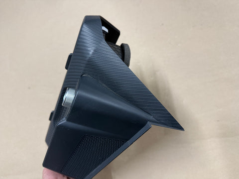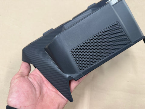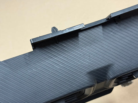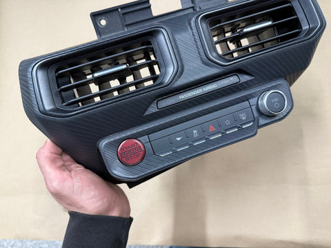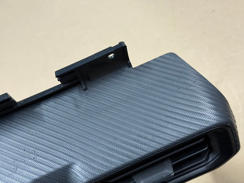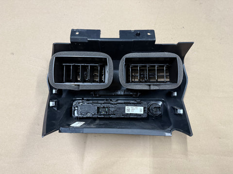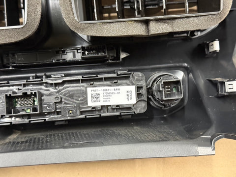 This is the center dash trim piece that would mount under radio location. Car had 2 screens. Has the push start button and some button controls. There are some scratches on the top and bottom as shown. Part numbers are pictured.