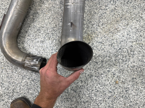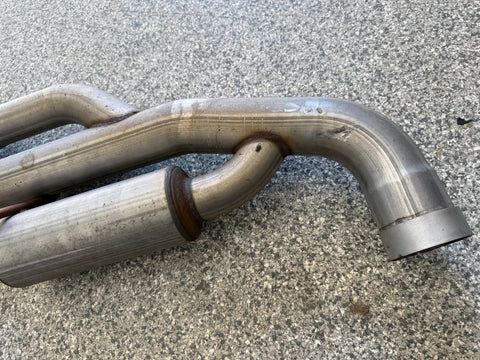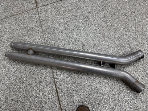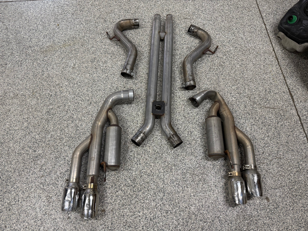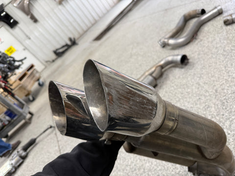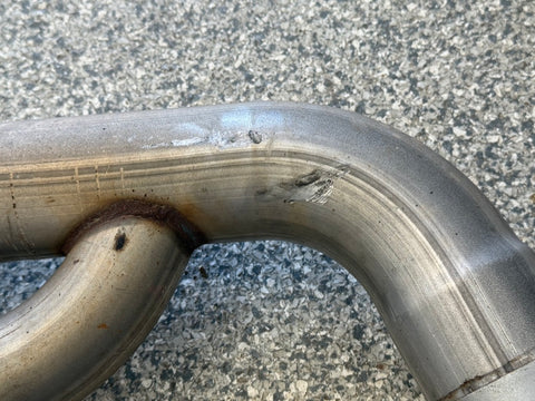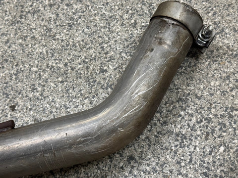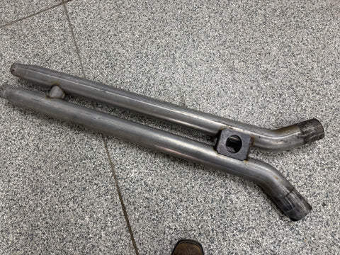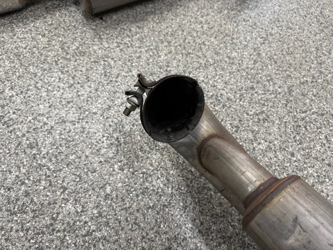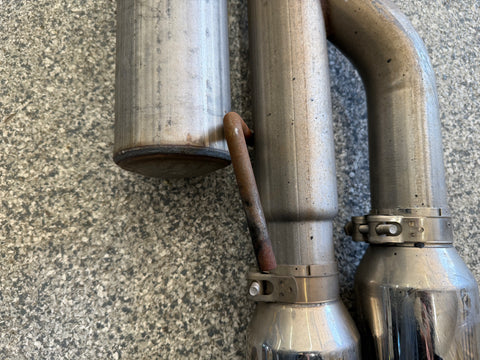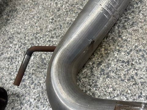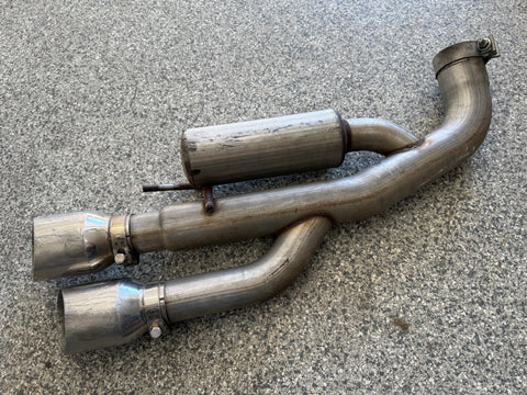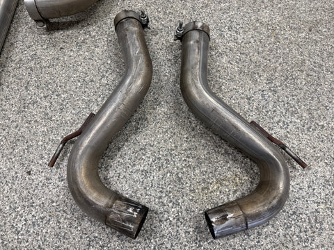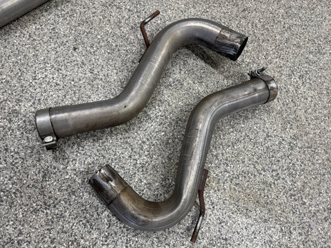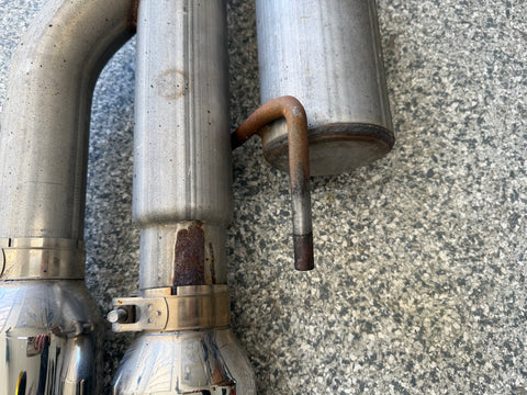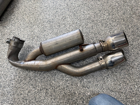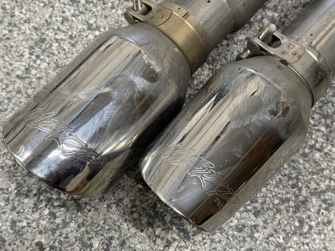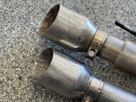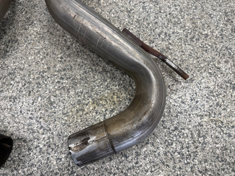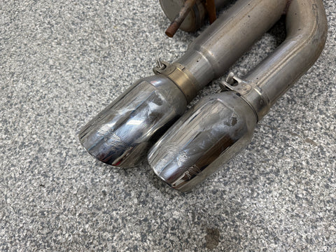 Exhaust is pretty beat up. The Passenger side muffler is badly bent on the rear side where it connects to the smaller pipe. That pipe is bent pretty bad too. You can see the openings are ovals not circles. Muffler tips got smashed on the passenger side as shown. The side is pushed in and the bottoms are flat spotted with rash and scratches. Driver side tips are in okay shape showing some scratches and dents on the top of both. Rashing and small dings on the piping as well. Both hangers are bent for the mufflers. There is some road grime and light wear on them. Exhaust can be used for parts or will need some work to be used again.