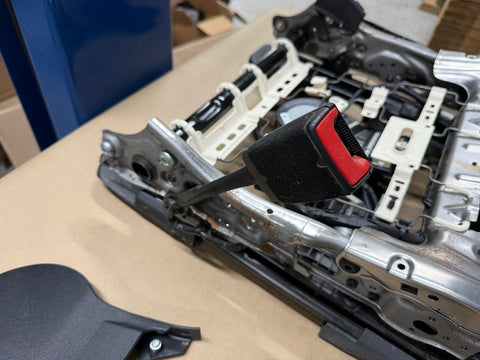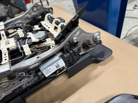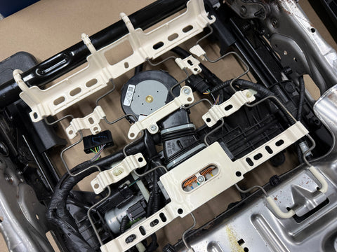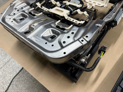 This is the LH/driver side lower seat frame with power track and motor. Perfect working condition with no damage. This comes with the trim pieces shown and the buttons as well. See the pictures. Lower frame does have heated and cooled options. There are some minor scuffs and scratches on the trim pieces due to everyday driving.