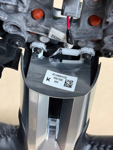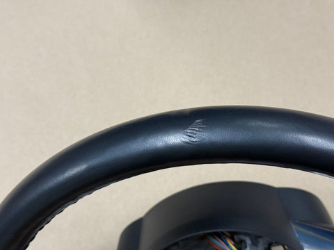 Trim pieces and buttons are in good shape. Missing the RH buttons as they went with the digital cluster. Leather is in good shape. It does have some light blemishes as shown as well as some slices in the leather at the top. They used a cable lock zip tie for the key and it left that mark. Otherwise the leather is in like new condition.