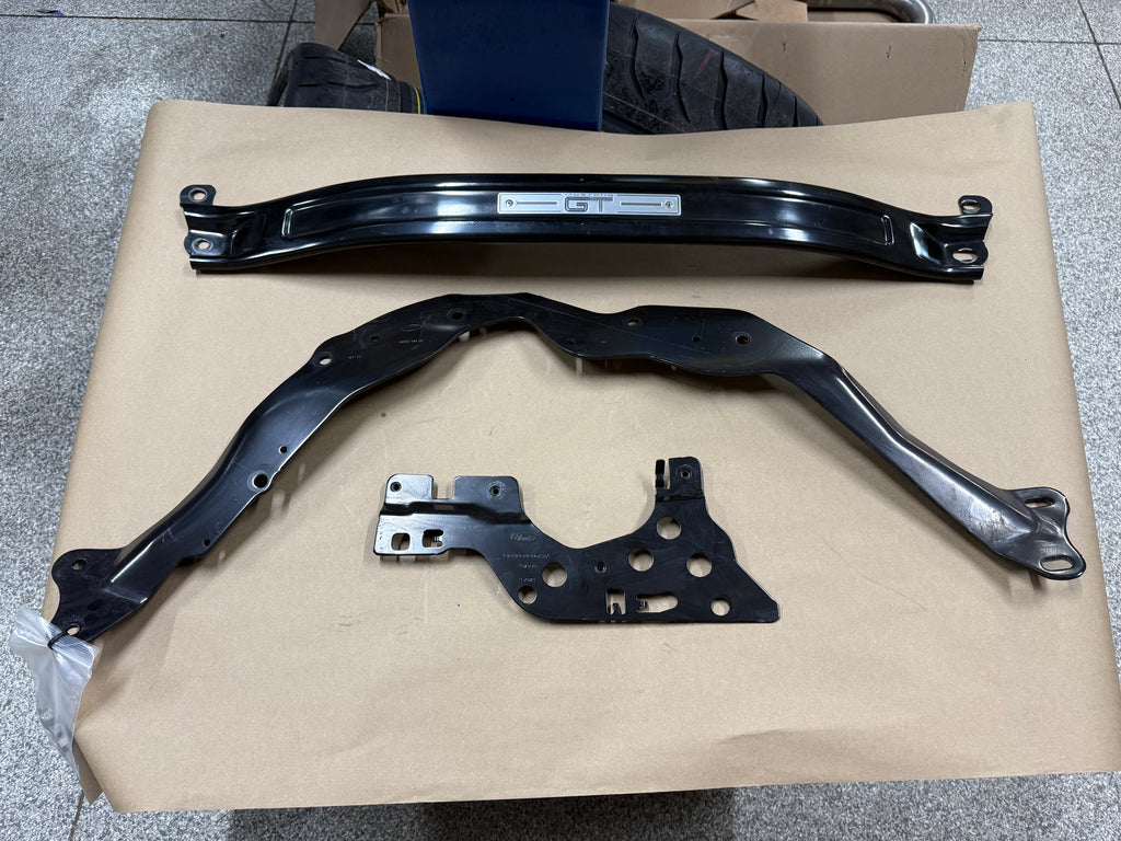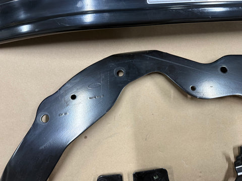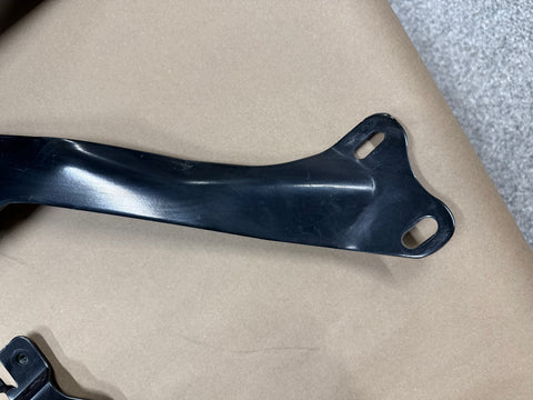 Finish on strut brace does have some nicks and scratches as well as some light surface rust. Some finish is missing where the hardware would mount. There's some scuffs and scratches as shown on steel black braces. All of these pieces are in good condition. Flaws are all clearly mentioned and pictured. Do your own research on fitment between models. Pictures show exact condition.