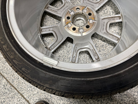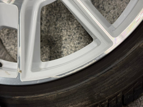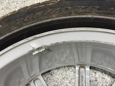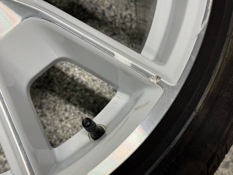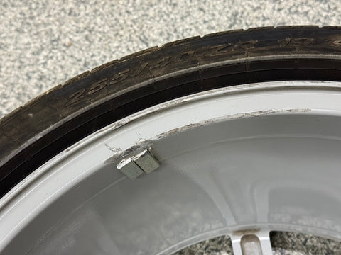 There are some surface scratches and rock chips from everyday driving. Nothing too crazy. There is some light curb rash shown on the front lip in 3 spots. Some rash on the backside of wheel as well. Tire machine and wheel weight markings on the backside also.