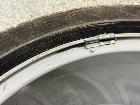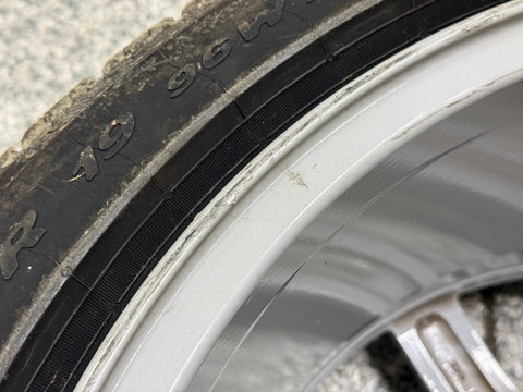 There are some surface scratches and rock chips from everyday driving. Nothing too crazy. There is some very light curb rash shown on the front and backside lip. Some lighter scratches as well as one small nick/gouge on the spokes. Tire machine and wheel weight markings on the backside also.