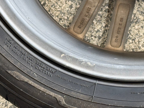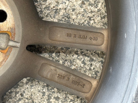 The wheel is in good condition. Rim has been painted black as shown. They did a nice job. There are a few scuffs and rock chips from everyday driving. Some scratches on the spokes as well. You can see them all over in the black finish. Very light curb rash in one spot along the outer edge of the lip. Could be easily fixed. Could use a nice polishing as well. Wheel weight and tire machine marks on the backside. Pretty nice shape for a used wheel.