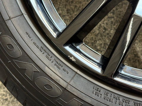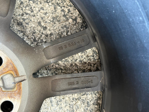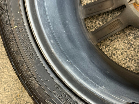 The wheel is in good condition. Rim has been painted black as shown. They did a nice job. There are a few scuffs and rock chips from everyday driving. Some scratches on the spokes as well. You can see them all over in the black finish. Light curb rash in one spot along the outer edge of the lip. There are a couple spots of curb rash on the backside as well. Could be easily fixed. Could use a nice polishing as well. Wheel weight and tire machine marks on the backside.