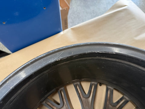 There are a good amount of surface scratches and scuffs on face of wheel. Small nicks and rock chips as well. There are a couple smaller gouges in the spokes. Fairly common with the black factory wheels. Strap marks shown through the spokes as well from being trailered. Curb rash shown on the front and back side as well in multiple spots. Wheel weight and tire machine marks on the backside as well. Wheel will need some work if you want it to be perfect again.