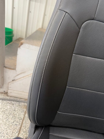 Driver seat is the same as passenger. The leather is very dry and hard. The pattern has started to shift due to that reason. There are some big cracks and splits in the leather on the bolster and lower seat cover as shown. Best bet for this set is to replace all the covers with new ones. Seats are NOT blown out.