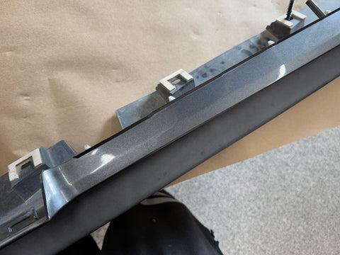 LH/driver side skirt molding. Paint is in okay shape. There are a coupe decent sized nicks/rock chips in the paint. See the pictures. There are some surface scratches on skirt from everyday driving. There are some small rock chips around the wheel opening ends from everyday driving. Lower trim piece does have some scratches and rock chips on it as pictured. Structurally appears to be in nice condition. The plastic mudflap piece on the rear side has one broken mounting tab as shown. Missing a few clips and some clips may be broken, almost impossible to get out without breaking them. Zoom in on pictures to get a good look. Pictures are exact item.