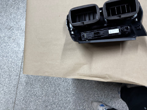 This is the center dash trim piece that would mount under radio location. Has the push start button and some button controls. There are some scratches on the underside. Part numbers are pictured.