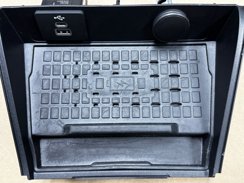 This is the wireless charging pad with trim piece. Located on the front part of center console. Come with rubber pad as pictured. Part numbers are pictured.
